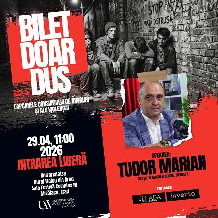 VEST. Universitatea „Aurel Vlaicu” din Arad va găzdui marți, 29 aprilie 2026, de la ora 11:00, în Sala Festivă Complex M, Micălaca, evenimentul „Bilet doar dus – Capcanele consumului de droguri și ale violenței”, dedicat conștientizării riscurilor asociate consumului de substanțe interzise și comportamentelor violente.