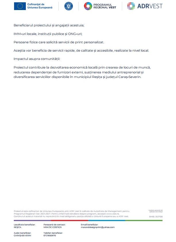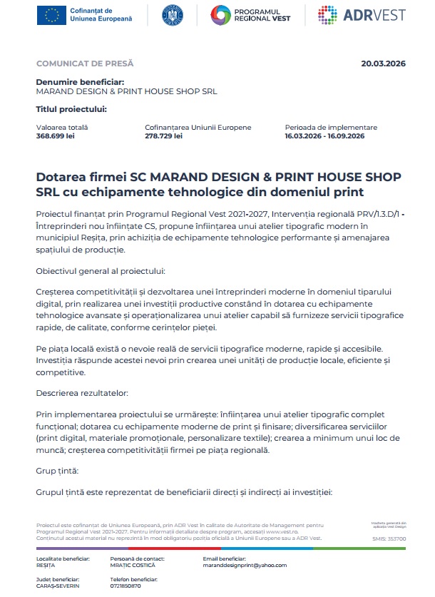 In Advertorial COMUNICAT DE PRESĂ MARAND DESIGN & PRINT HOUSE SHOP 20 martie 2026, 11:15 AM 1 minut de citire Share Share on Facebook Share on Twitter Email adr vestcaras severincomunicat de presaechipamentemarandpr vestprintResitatehnologice 0 Articole recomandate Goje, proiecte rapide și cu impact direct pentru oameni 2026-03-20 Târgul Mare de Primăvară de la Răcășdia, ediția 48 2026-03-20 Suporterii rosso-neri vor organiza Centenarul CSM Reșița 2026-03-20 Adaugă comentariu Cancel Reply Salvează datele în browser pentru comentariile viitoare.
