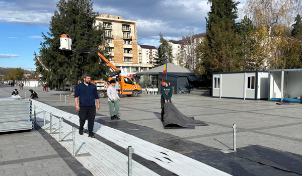 Echipele au adus structurile metalice, panourile și instalațiile necesare funcționării patinoarului. Zona a fost deja delimitată, iar muncitorii montează platforma pe care va fi turnată gheața artificială. Patinoarul va fi una dintre principalele atracții ale Festivalului de Crăciun organizat de Primăria Reșița.